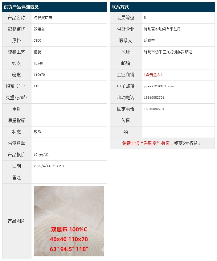 4月14日,濰坊富華紡織有限公司純棉雙層布JC100 40x40 110x70 118",報價為10元/米,實際成交價以協(xié)商為準。[點擊查看詳情]