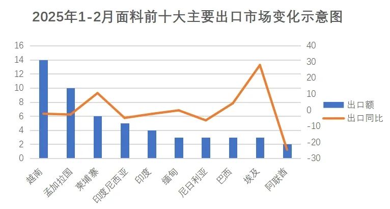 亞洲是我國面料出口主要市場,2025年1-2月我國對亞洲國家出口面料66.1億美元,占面料出口總額的64.7%。在前十大目標市場出口中,亞洲市場占8席。越南作為我國面料出口最大的單一市場,占我國面料對全球出口的13.9%,出口額14.2億美元,同比下降2.3%。