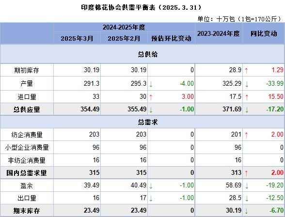 截至2025年3月31日,印度棉花協(xié)會(CAI)預(yù)計2024/25年度印度棉花產(chǎn)量為2913萬包,較2月預(yù)估值2953萬噸下調(diào)40萬包。最新產(chǎn)量預(yù)估較2023/24年度的3252.9萬噸低339.9萬噸,若預(yù)測準確,降幅為10.4%。