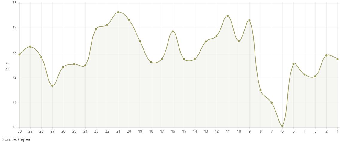 4月15日(周二),巴西CEPEA/ESALQ棉花價(jià)格指數(shù)報(bào)72.75美分/磅,較前一交易日下跌0.21%,該指數(shù)較前月同期下跌1.26%。