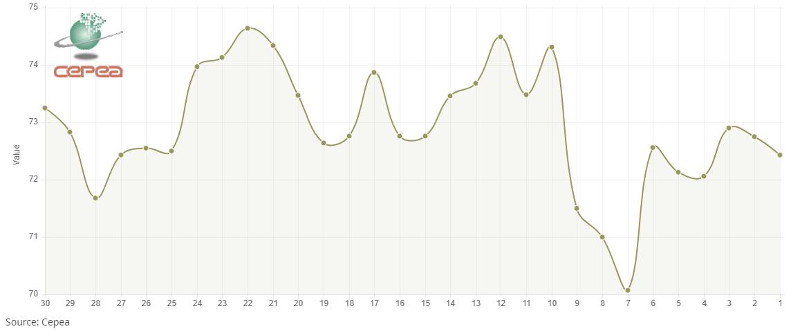 4月16日(周三),巴西CEPEA/ESALQ棉花價格指數(shù)報72.43美分/磅,較前一交易日下跌0.44%,該指數(shù)較前月同期下跌1.70%。