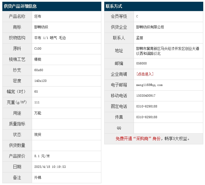 4月18日,邯鄲紡織有限公司外棉純棉平布JC100 60x60 140x120 65" 1/1 111g/㎡ 噴氣 毛邊,報(bào)價(jià)為8.1元/米,實(shí)際成交價(jià)以協(xié)商為準(zhǔn)。[點(diǎn)擊查看詳情]