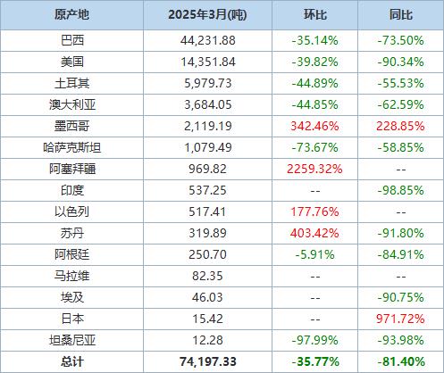 據(jù)海關(guān)統(tǒng)計(jì)數(shù)據(jù),2025年3月我國(guó)進(jìn)口棉花約7萬(wàn)噸,環(huán)比減少約5萬(wàn)噸,同比下降約81.4%。