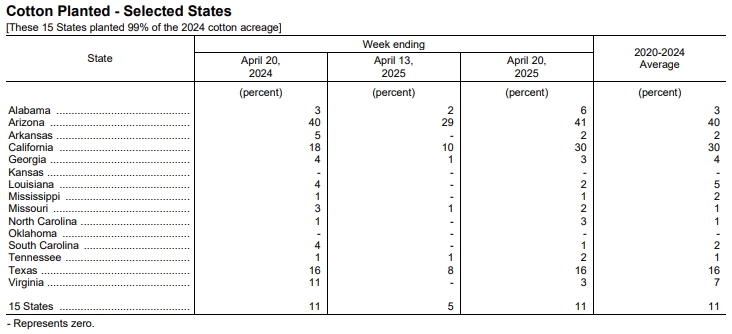 據(jù)美國農(nóng)業(yè)部網(wǎng)站消息,美國農(nóng)業(yè)部(USDA)在每周作物生長報告中公布稱,截至2025年4月20日當(dāng)周,美棉種植率為11%,前周為5%,去年同期為11%,五年均值為11%。