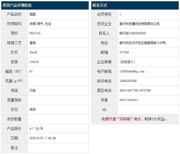 4月23日,滕州宏鷹紡織有限責任公司高配滌棉府綢T65/C35 45x45 110x76 67" 噴氣 光邊,報價為4.7元/米,實際成交價以協(xié)商為準。[點擊查看詳情]