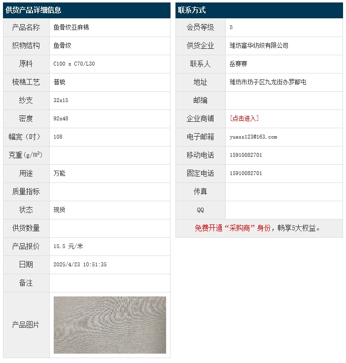 4月23日,濰坊富華紡織有限公司魚骨紋亞麻棉布C100xC70/L30 32x15 92x48 108",報價為15.5元/米,實際成交價以協(xié)商為準。[點擊查看詳情]