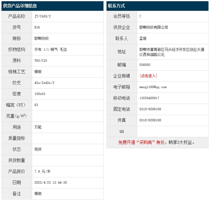 4月23日,邯鄲紡織有限公司滌棉平布T65/JC35 45s/2x45s/2 100x55 63" 1/1 噴氣 毛邊,報(bào)價(jià)為7.9元/米,實(shí)際成交價(jià)以協(xié)商為準(zhǔn)。[點(diǎn)擊查看詳情]