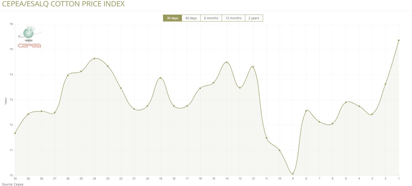4月22日(周二),巴西CEPEA/ESALQ棉花價(jià)格指數(shù)報(bào)75.36美分/磅,較前一交易日(17日)上漲2.35%,較上月同期上漲2.28%。