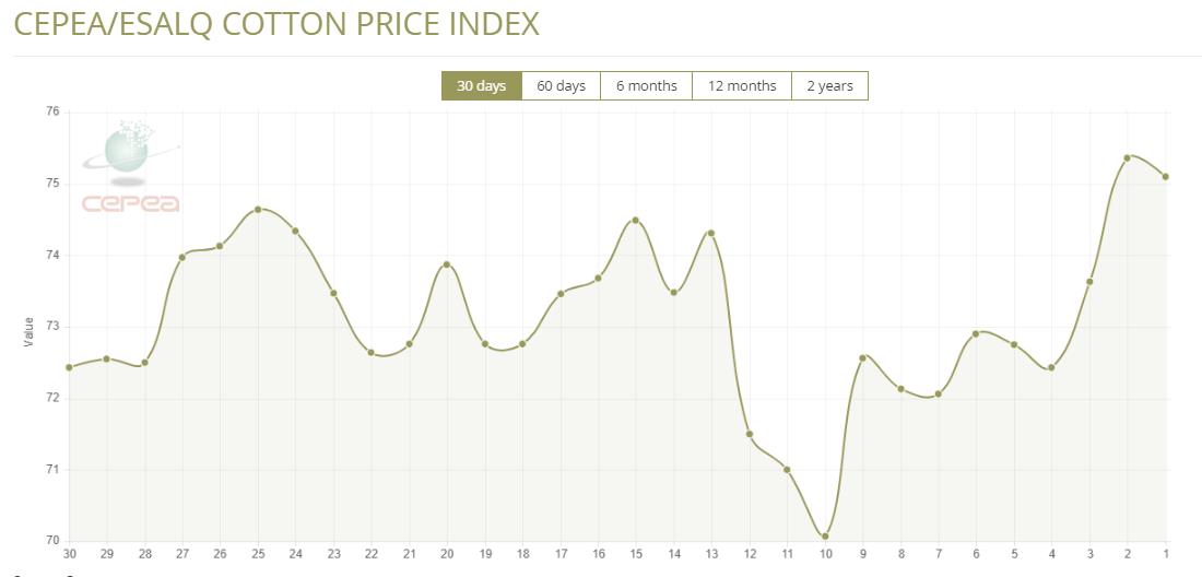 4月23日(周三),巴西CEPEA/ESALQ棉花價格指數(shù)報75.33美分/磅,較前一交易日(17日)下跌0.34%,較上月同期上漲1.94%。