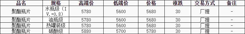 華東聚酯瓶片價格上漲30元至5680元/噸,PX帶動PTA價格上行,推動聚酯瓶片市場重心上揚。工廠報價上調(diào)50-60元/噸,4-5月貨源報盤5600-5780元/噸,局部略高5850元/噸;零星遞盤5600-5650元/噸。