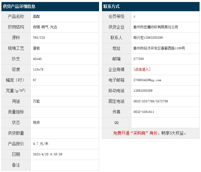 4月28日,滕州宏鷹紡織有限責(zé)任公司高配滌棉府綢T65/C35 45x45 110x76 67" 噴氣 光邊,報(bào)價(jià)為4.7元/米,實(shí)際成交價(jià)以協(xié)商為準(zhǔn)。[點(diǎn)擊查看詳情]