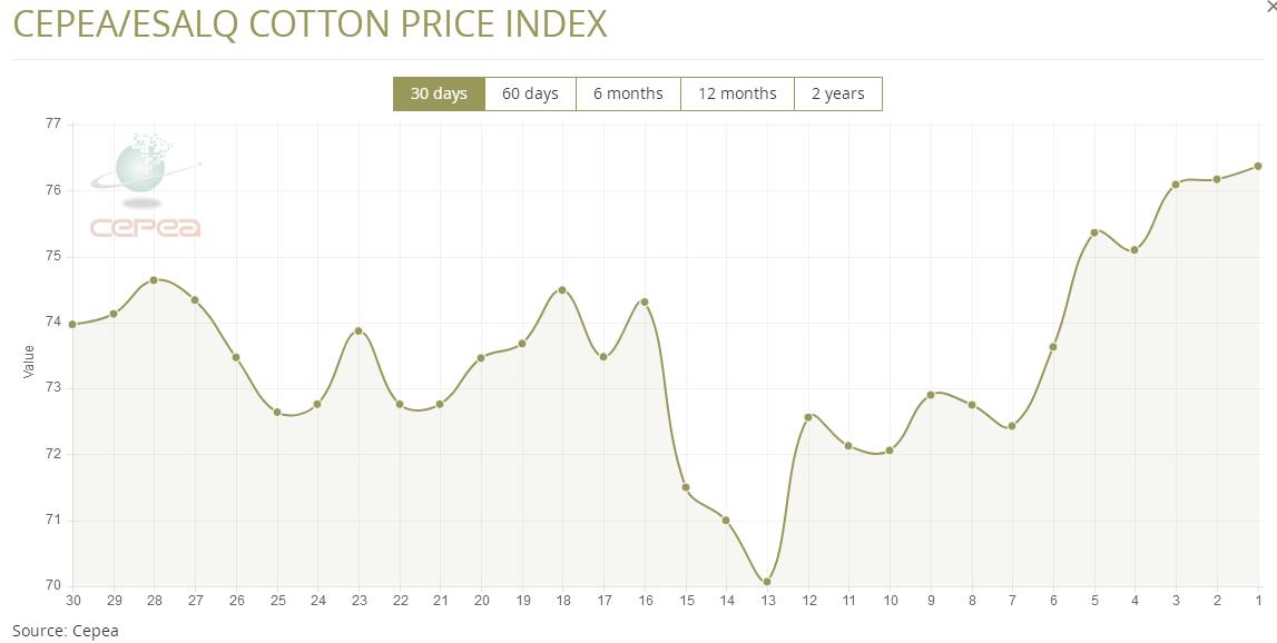 4月28日(周一),巴西CEPEA/ESALQ棉花價(jià)格指數(shù)報(bào)76.37美分/磅,較前一交易日上漲0.26%,較上月同期攀升3.65%。