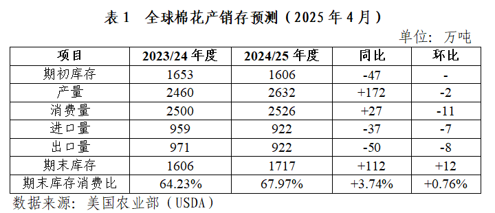 據(jù)美國農(nóng)業(yè)部4月預(yù)測,2024/25年度全球棉花產(chǎn)量2632萬噸,同比增加172萬噸,環(huán)比調(diào)減2萬噸;全球棉花消費量2526萬噸,同比增加27萬噸,環(huán)比調(diào)減11萬噸;產(chǎn)大于需106萬噸,環(huán)比擴大10萬噸;全球棉花庫存消費比為67.97%,較上年度上升3.74個百分點,環(huán)比增加0.76個百分點。