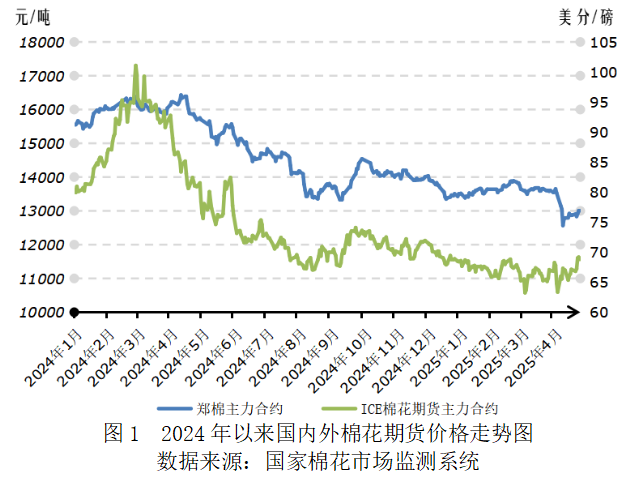 4月以來,美國“對等關(guān)稅”政策成為擾動國內(nèi)外棉市的主要因素,政策的朝令夕改使全球貿(mào)易秩序陷入混亂,經(jīng)濟前景不確定性陡升。全球前兩大經(jīng)濟體美國和中國貿(mào)易對峙持續(xù),市場信心受挫,內(nèi)外棉價走勢波動加劇,相比之下,外棉走勢強于內(nèi)棉。