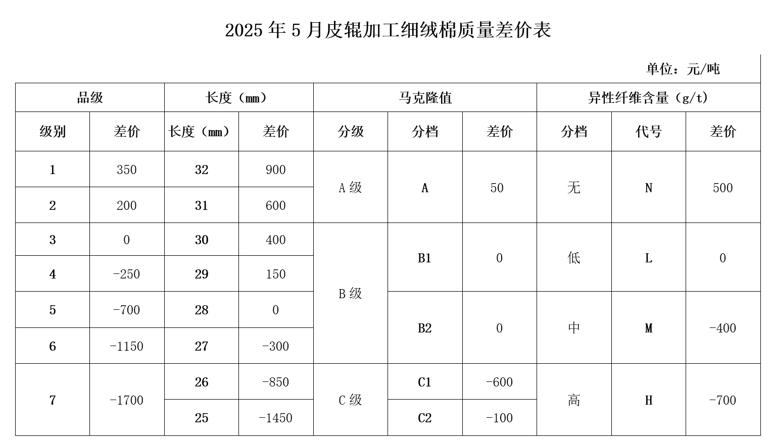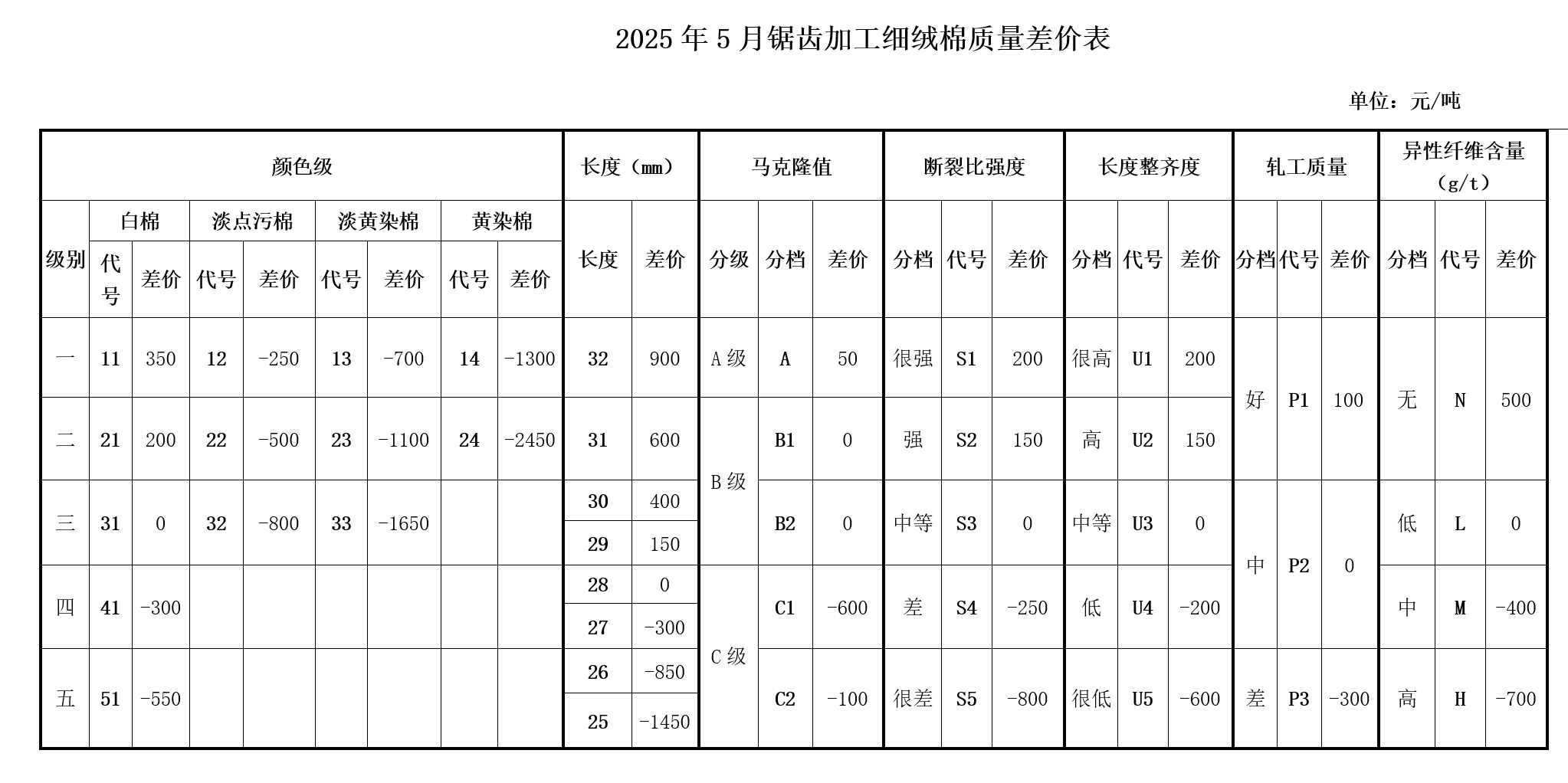 根據(jù)《中國棉花協(xié)會國產(chǎn)棉質(zhì)量差價表管理辦法》規(guī)定,現(xiàn)正式發(fā)布2025年5月《鋸齒加工細絨棉質(zhì)量差價表》、《皮輥加工細絨棉質(zhì)量差價表》、《長絨棉質(zhì)量差價表》(單位:元/噸)。