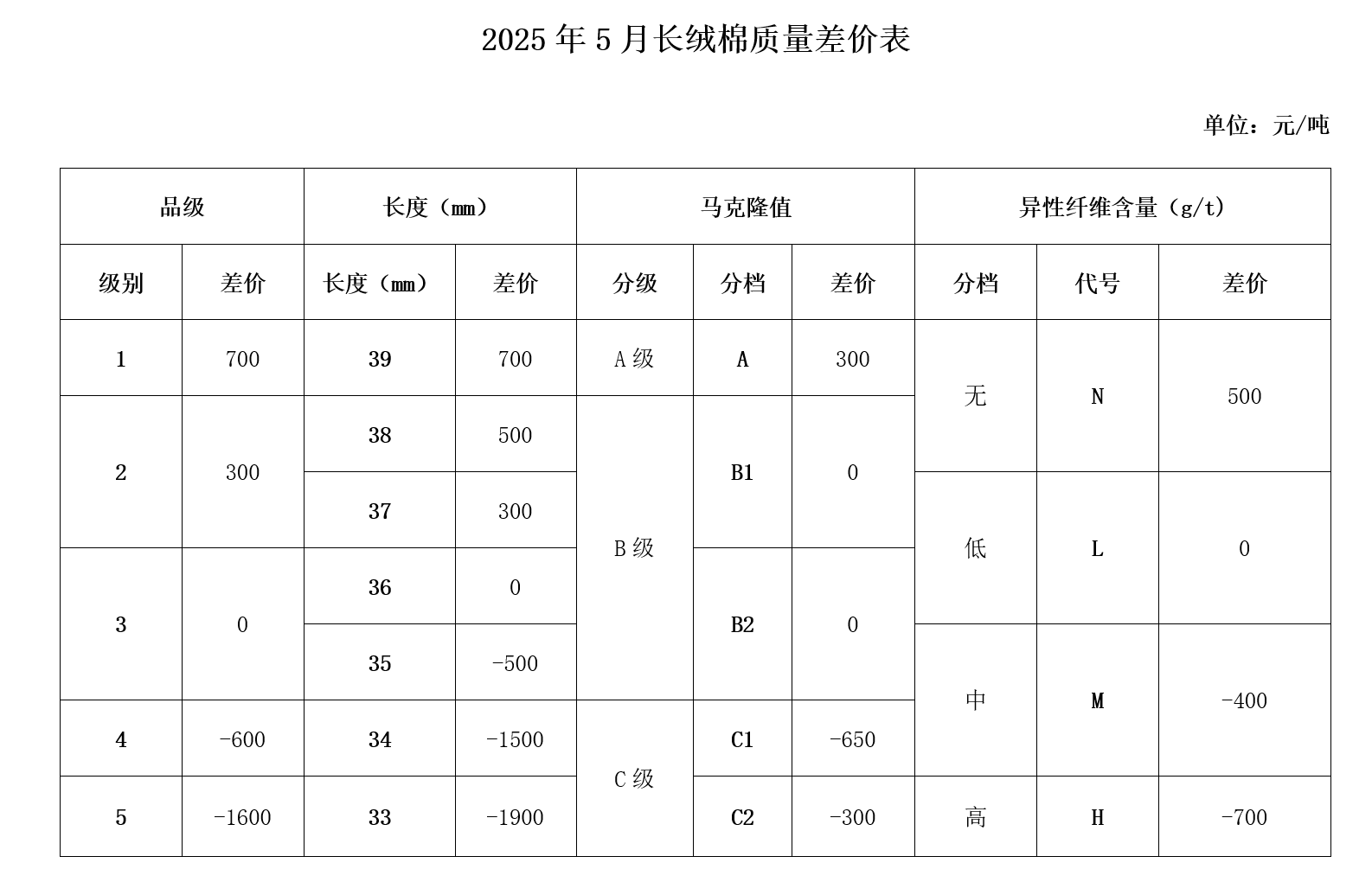 依據(jù)2025年4月的棉花公檢質(zhì)量數(shù)據(jù)、中國棉花協(xié)會質(zhì)量差價系統(tǒng)采集的加工企業(yè)銷售價和紡織廠到廠價,及當月的中國棉花價格指數(shù),并征求業(yè)內(nèi)相關(guān)專家的意見,與上月相比,與上月相比做出如下調(diào)整: