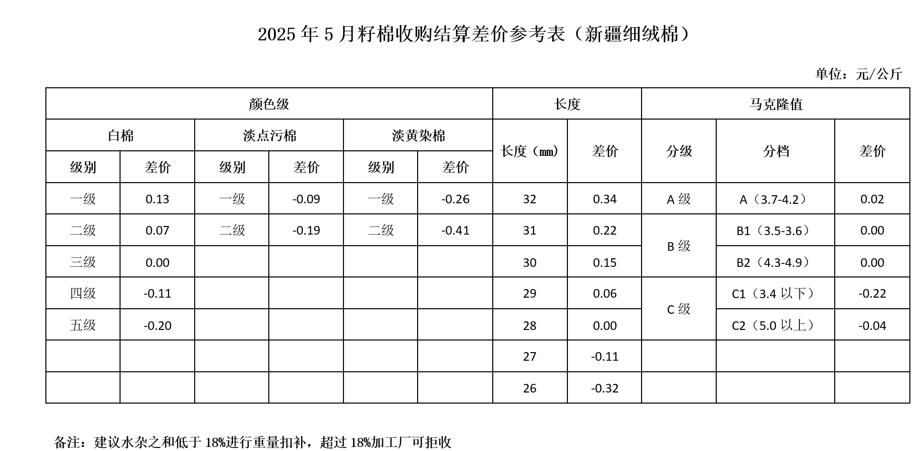 依據(jù)中國棉花協(xié)會發(fā)布的2025年4月《鋸齒加工細(xì)絨棉質(zhì)量差價表》和2024年9月-2025年2月新疆籽棉平均衣分率,折算得出籽棉收購差價,與上月相比,做如下調(diào)整: