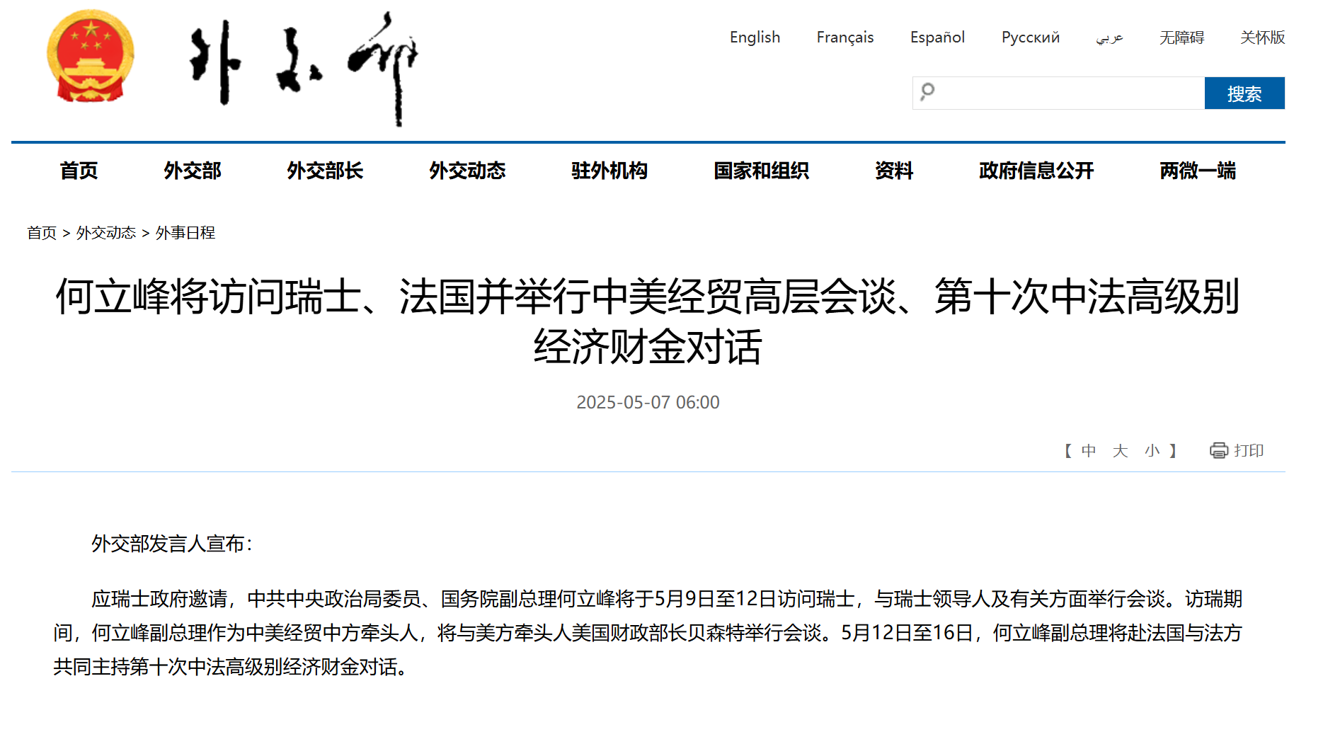 外交部發(fā)言人宣布:應(yīng)瑞士政府邀請(qǐng),中共中央政治局委員、國(guó)務(wù)院副總理何立峰將于5月9-12日訪問(wèn)瑞士,與瑞士領(lǐng)導(dǎo)人及有關(guān)方面舉行會(huì)談。訪瑞期間,何立峰副總理作為中美經(jīng)貿(mào)中方牽頭人,將與美方牽頭人美國(guó)財(cái)政部長(zhǎng)貝森特舉行會(huì)談。5月12-16日,何立峰副總理將赴法國(guó)與法方共同主持第十次中法高級(jí)別經(jīng)濟(jì)財(cái)金對(duì)話。