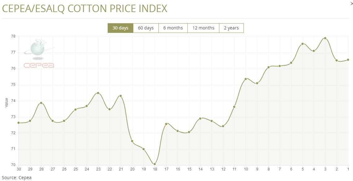 5月6日(周二),巴西CEPEA/ESALQ棉花價(jià)格指數(shù)報(bào)76.56美分/磅,較前一交易日上漲0.05%,較上月同期下滑0.71%。