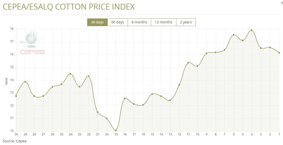 5月7日(周三),巴西CEPEA/ESALQ棉花價格指數(shù)報76.15美分/磅,較前一交易日下跌0.54%,較上月同期下滑1.24%。
