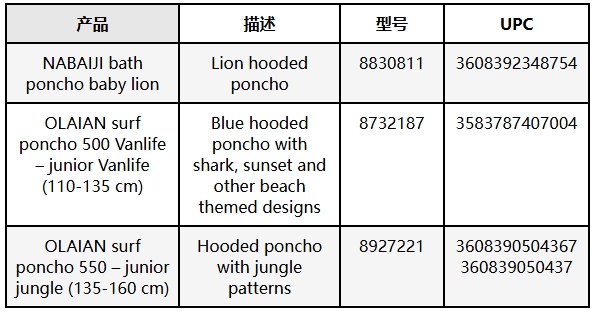 此次召回產(chǎn)品為OLAIAN和NABAIJI的兒童沖浪斗篷。產(chǎn)品有各種顏色和圖案,具體召回產(chǎn)品信息如下: