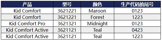 此次召回產(chǎn)品為Kid Comfort, Kid Comfort Pro, and Kid Comfort Active的兒童背帶。產(chǎn)品有3款,顏色不同,型號分別為3621221、3621321、3621121。具體召回產(chǎn)品信息如下: