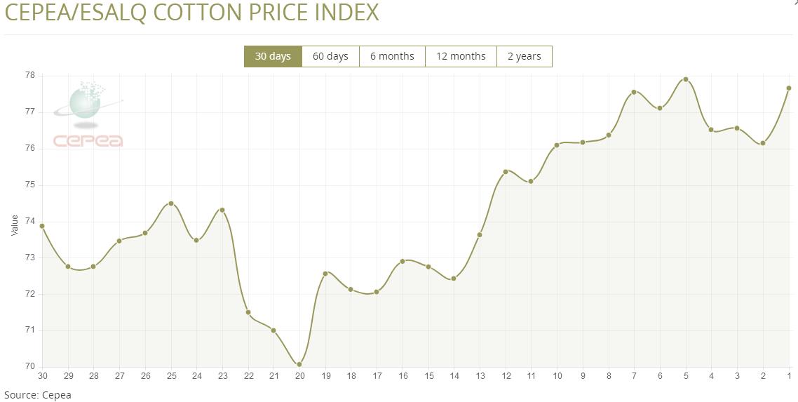 5月8日(周四),巴西CEPEA/ESALQ棉花價格指數(shù)報77.66美分/磅,較前一交易日上漲1.98%,較上月同期上漲0.71%。