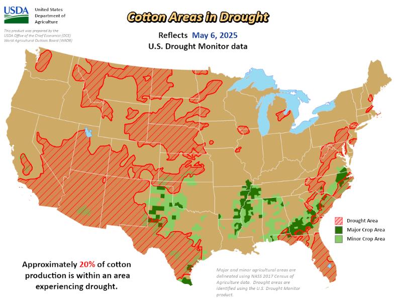 美國農(nóng)業(yè)部(USDA)下屬的首席經(jīng)濟學家辦公室(OCE)當?shù)貢r間周四根據(jù)當日發(fā)布的美國旱情監(jiān)測圖整理的美國農(nóng)業(yè)旱情文件顯示,截至5月6日當周,約20%美棉產(chǎn)區(qū)受到干旱影響,前周為21%。
