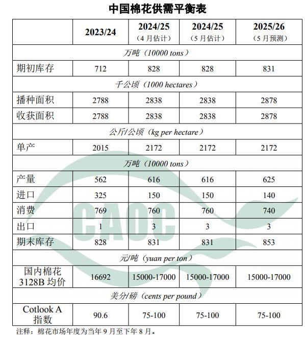 本月對(duì)2024/25年度棉花供需形勢(shì)估計(jì)值與上月保持一致。本月預(yù)測(cè),2025/26年度中國(guó)棉花播種面積為2878千公頃(4317.0萬(wàn)畝),較上年度增1.4%。新疆棉花目標(biāo)價(jià)格補(bǔ)貼政策穩(wěn)定,棉農(nóng)植棉積極性較高,面積穩(wěn)中略增;內(nèi)地棉區(qū)受比較效益低、機(jī)械化推廣難度大等因素影響,面積繼續(xù)下滑。棉花播種出苗期間主產(chǎn)區(qū)綜合氣候條件適宜,預(yù)計(jì)單產(chǎn)為每公頃2172公斤(每畝144.8公斤),與上年度持平。棉花產(chǎn)量625萬(wàn)噸,較上年度增1.4%。受美國(guó)濫施關(guān)稅影響,棉花消費(fèi)存在偏弱預(yù)期,但未來(lái)仍有一定不確定性,預(yù)計(jì)新年度棉花消費(fèi)740萬(wàn)噸,較上年度小幅調(diào)減20萬(wàn)噸,進(jìn)口量下調(diào)10萬(wàn)噸至140萬(wàn)噸。