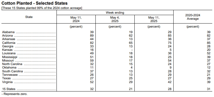 據(jù)美國農(nóng)業(yè)部網(wǎng)站消息,美國農(nóng)業(yè)部(USDA)在每周作物生長報告中公布稱,截至2025年5月11日當(dāng)周,美棉種植率為28%,前周為21%,去年同期為32%,五年均值為31%。
