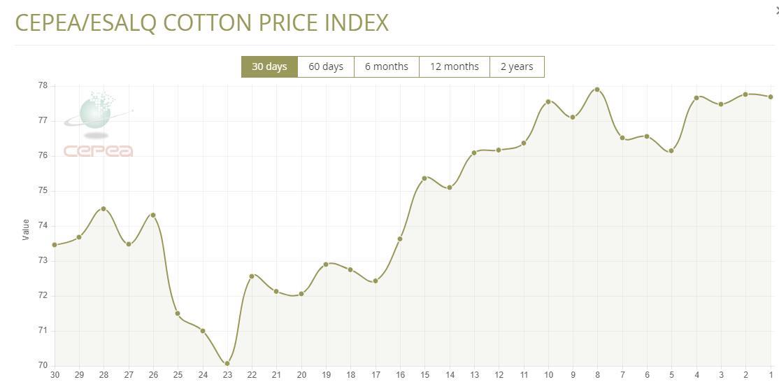 5月13日(周二),巴西CEPEA/ESALQ棉花價格指數(shù)報77.69美分/磅,較前一交易日下滑0.09%,較上月同期上漲0.75%。