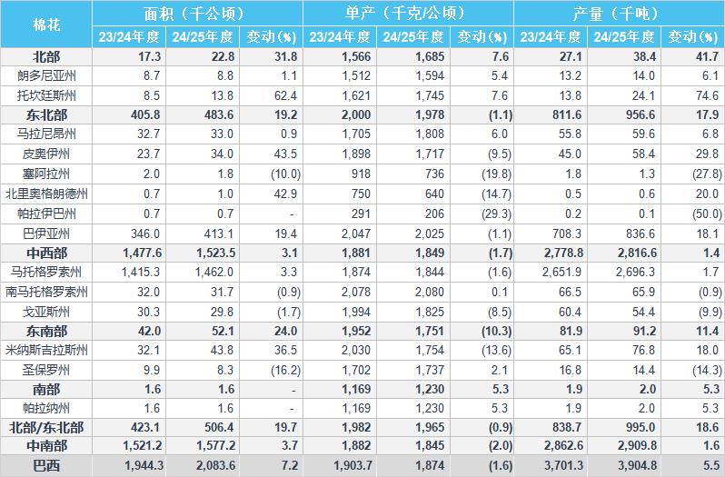 2024/25年度巴西棉花種植面積預(yù)估為208.36萬(wàn)公頃,同比增加7.2%,2023/24年度為194.43萬(wàn)公頃。