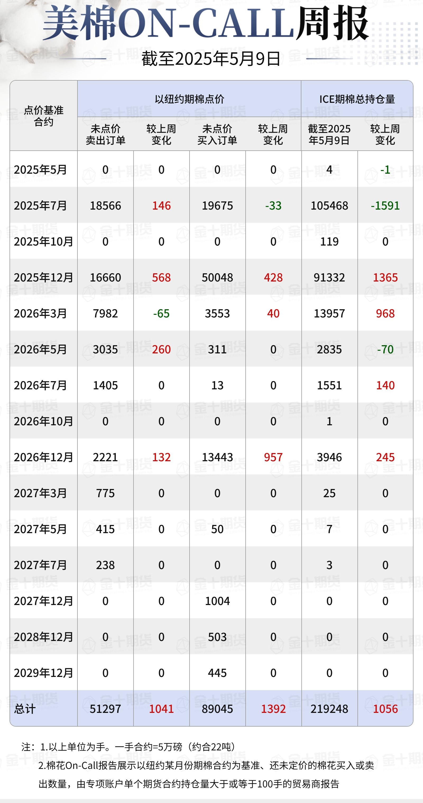 據(jù)美國(guó)商品期貨交易委員會(huì)(CFTC)最新數(shù)據(jù),截至5月9日,①美棉ON-call未點(diǎn)價(jià)賣(mài)出訂單51297手,環(huán)比增加1041手;未點(diǎn)價(jià)買(mǎi)入訂單89045手,環(huán)比增加1392手;②ICE期棉2505合約上賣(mài)方未點(diǎn)價(jià)合約為0手,環(huán)比增加0手;③ICE期棉2507合約上賣(mài)方未點(diǎn)價(jià)合約為18566手,環(huán)比增加146手;④ICE棉花期貨盤(pán)面2024/25年度(8月至次年7月)的ON-call合約未點(diǎn)價(jià)賣(mài)出訂單為18566手,環(huán)比增加146手。