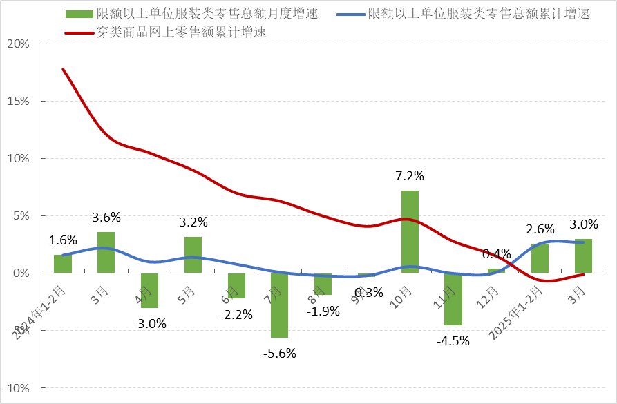 1季度,在國(guó)內(nèi)宏觀經(jīng)濟(jì)平穩(wěn)向好、促消費(fèi)政策發(fā)力顯效以及春節(jié)假期效應(yīng)等因素的支撐下,我國(guó)服裝內(nèi)銷(xiāo)市場(chǎng)實(shí)現(xiàn)溫和增長(zhǎng)。據(jù)國(guó)家統(tǒng)計(jì)局?jǐn)?shù)據(jù),1-3月我國(guó)限額以上單位服裝類(lèi)商品零售額累計(jì)2835.1億元,同比增長(zhǎng)2.7%,增速比2024年全年加快2.6個(gè)百分點(diǎn)。其中,3月限額以上單位服裝類(lèi)商品零售額同比增長(zhǎng)3.0%,增速比1-2月加快0.4個(gè)百分點(diǎn)。同期,線上服裝銷(xiāo)售出現(xiàn)小幅波動(dòng),穿類(lèi)商品網(wǎng)上零售額同比下降0.1%,降幅比1-2月收窄0.5個(gè)百分點(diǎn)。