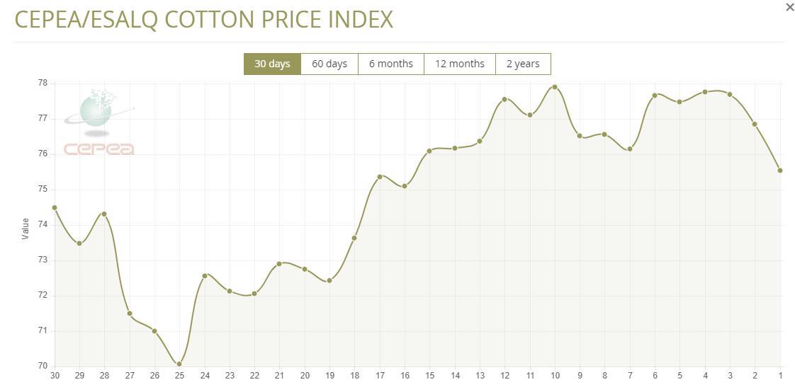 5月15日(周四),巴西CEPEA/ESALQ棉花價格指數(shù)報75.54美分/磅,較前一交易日下滑1.70%,較上月同期下滑2.04%。