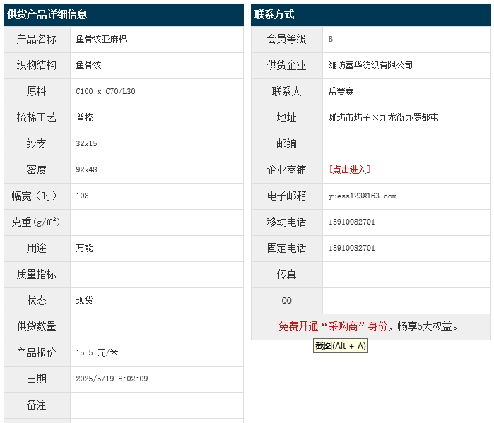 5月19日,濰坊富華紡織有限公司魚骨紋亞麻棉布C100xC70/L30 32x15 92x48 108",報(bào)價(jià)為15.5元/米,實(shí)際成交價(jià)以協(xié)商為準(zhǔn)。[點(diǎn)擊查看詳情]