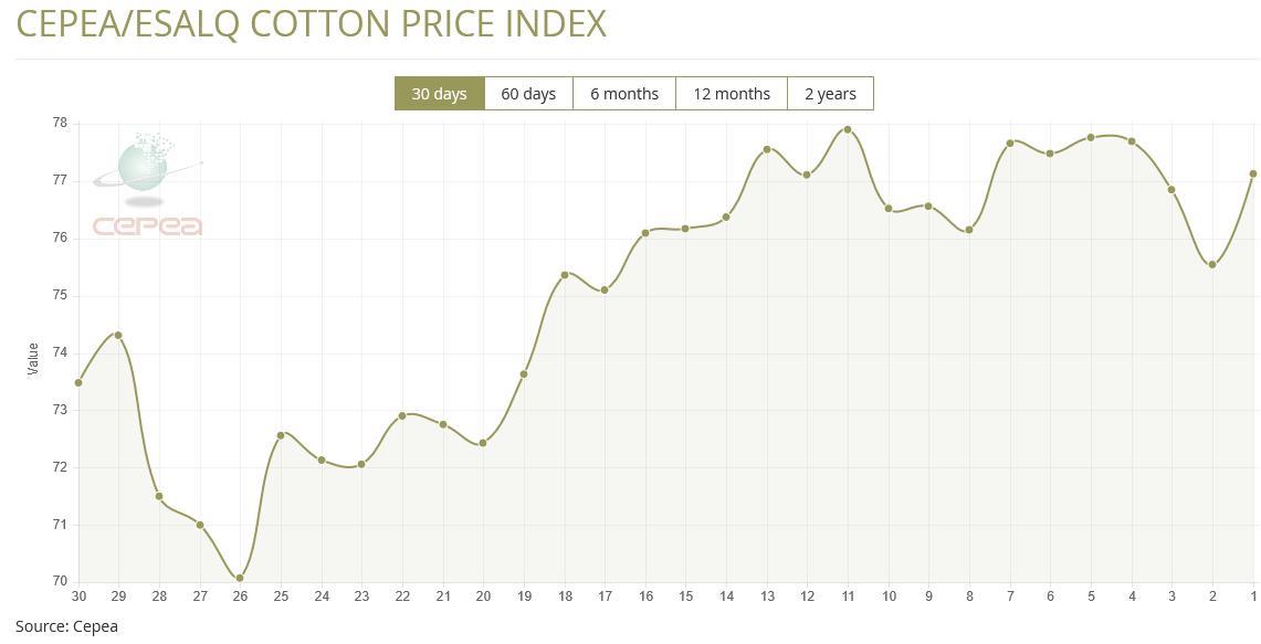 5月16日(周五),巴西CEPEA/ESALQ棉花價(jià)格指數(shù)報(bào)77.13美分/磅,較前一交易日上漲2.10%,較上月同期上漲0.03%。