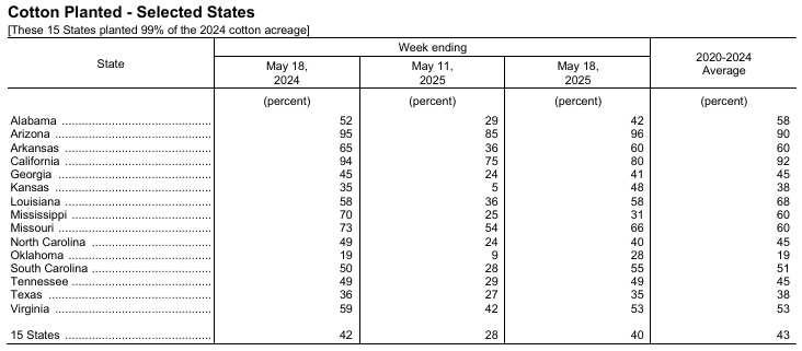 據(jù)美國農(nóng)業(yè)部網(wǎng)站消息,美國農(nóng)業(yè)部(USDA)在每周作物生長報(bào)告中公布稱,截至2025年5月18日當(dāng)周,美棉種植率為40%,前周為28%,去年同期為42%,五年均值為43%。