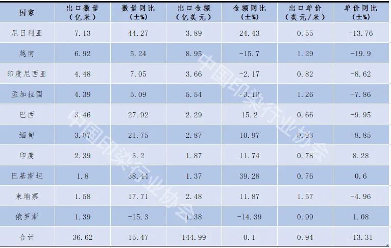 我國(guó)印染行業(yè)對(duì)主要市場(chǎng)的出口呈量增價(jià)跌態(tài)勢(shì)。1季度我國(guó)印染八大類(lèi)產(chǎn)品對(duì)東盟和RCEP貿(mào)易國(guó)出口數(shù)量分別增長(zhǎng)8.59%和8.45%,出口平均單價(jià)分別下滑13.65%和13.14%,降幅均高于行業(yè)出口平均水平。出口數(shù)量排名前十的國(guó)家中,僅對(duì)俄羅斯出口數(shù)量出現(xiàn)下滑,對(duì)其余國(guó)家出口數(shù)量均實(shí)現(xiàn)不同程度增長(zhǎng),其中對(duì)尼日利亞出口數(shù)量同比增幅達(dá)到44.27%,主要得益于當(dāng)?shù)卣掷m(xù)推進(jìn)的一系列改革措施,包括彌補(bǔ)收入流失、強(qiáng)化機(jī)構(gòu)間合作及推動(dòng)貿(mào)易主體自愿遵守法規(guī)等;對(duì)巴西、緬甸、巴基斯坦出口數(shù)量增速均超過(guò)20%。從出口平均單價(jià)看,對(duì)前十國(guó)家出口單價(jià)平均下降13.31%,其中對(duì)越南出口單價(jià)下降最明顯,降幅接近20%,對(duì)印度、巴基斯坦、俄羅斯出口單價(jià)有所增長(zhǎng)。