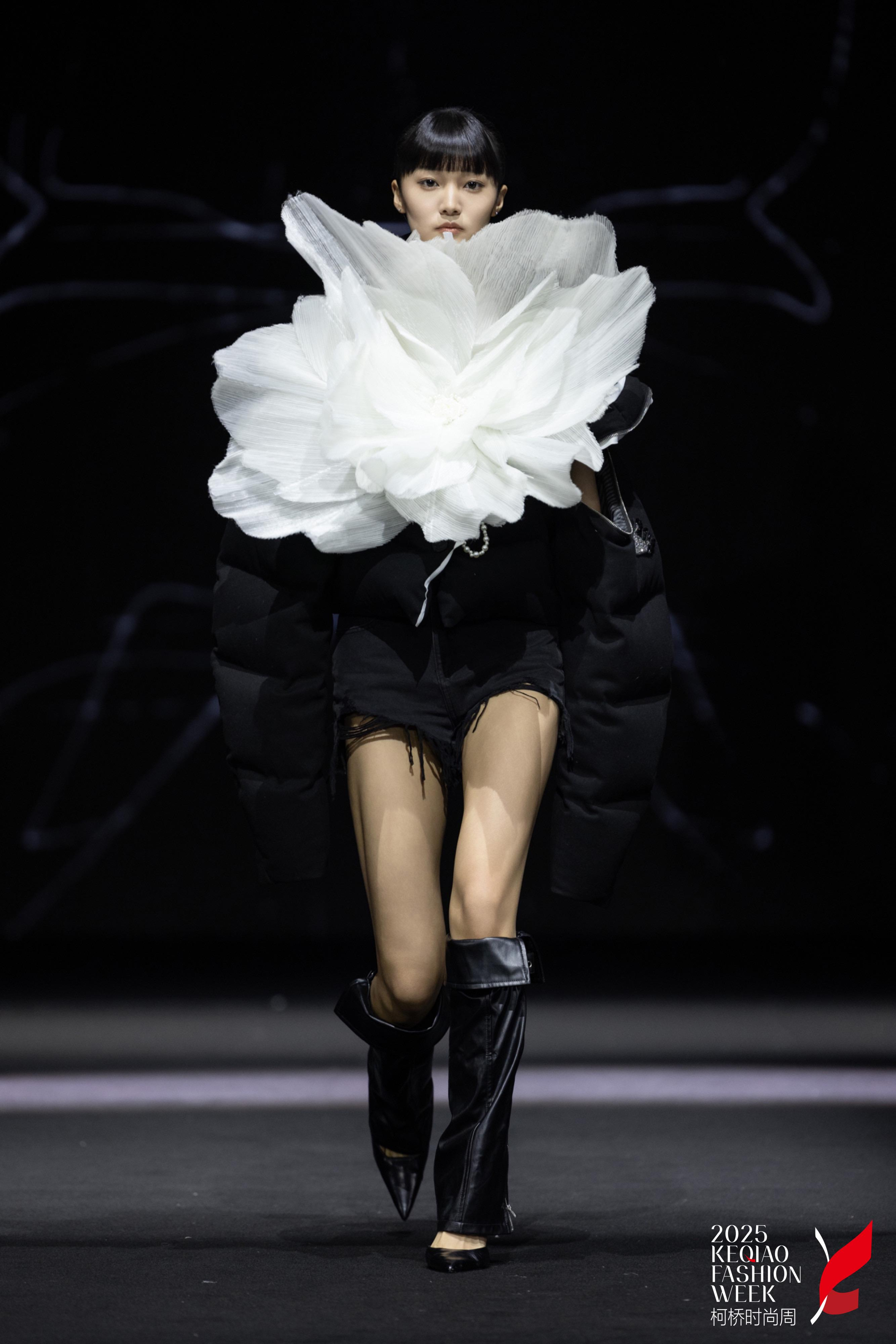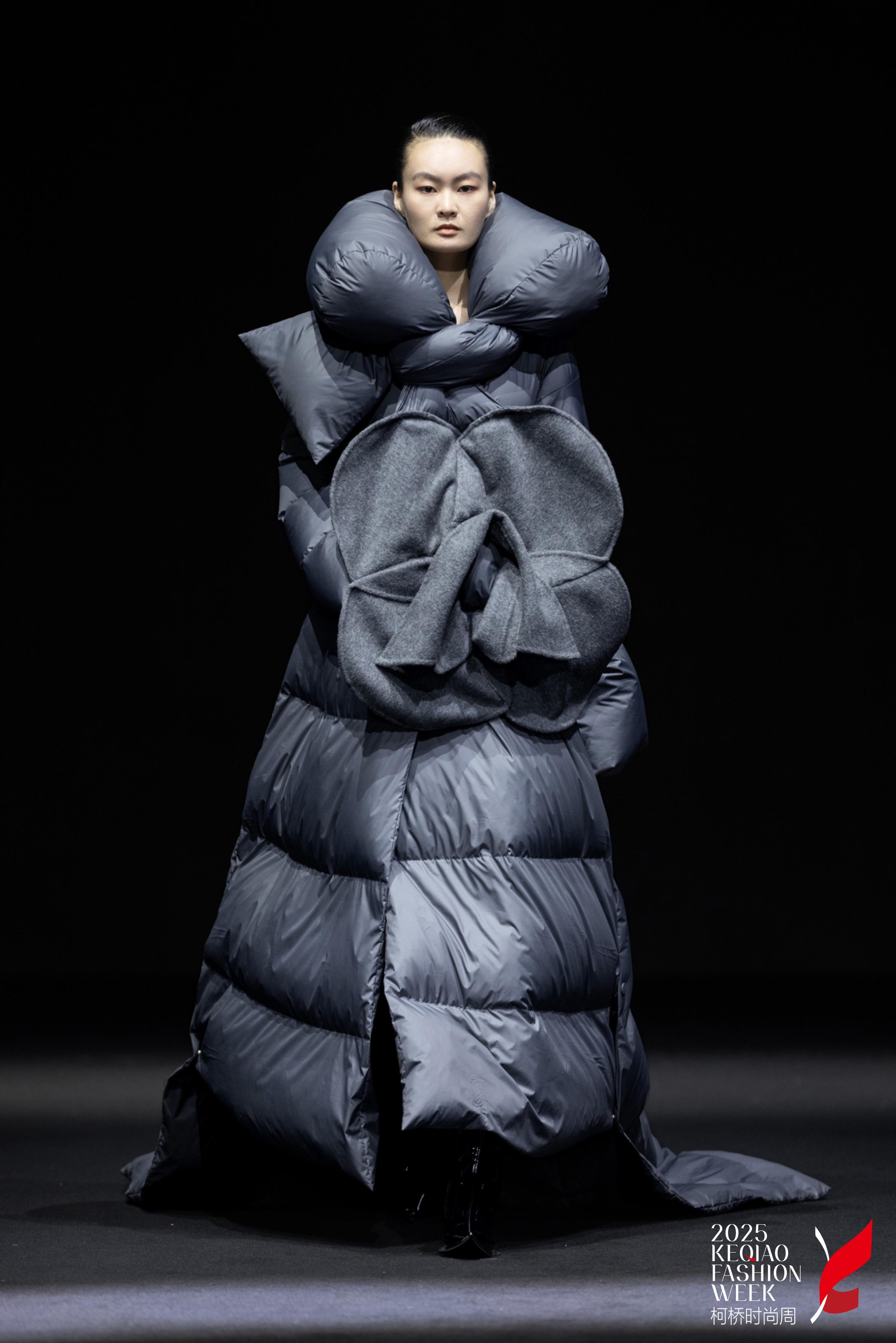 從含苞的通勤戰(zhàn)袍到盛放的戶外軟殼,每件作品皆是羽絨與花朵的基因重組:職場西裝領(lǐng)口綻出山茶褶皺,輕戶外軟殼腰際蔓延冰川苔蘚立體絨團(tuán),泡芙系列下擺則懸浮著破碎冰晶般的異形羽絨塊。這些曾被定義為「非羽絨服材質(zhì)」的醋酸緞、中空紗面料,在盛世天宇實(shí)驗(yàn)室獲得新生。