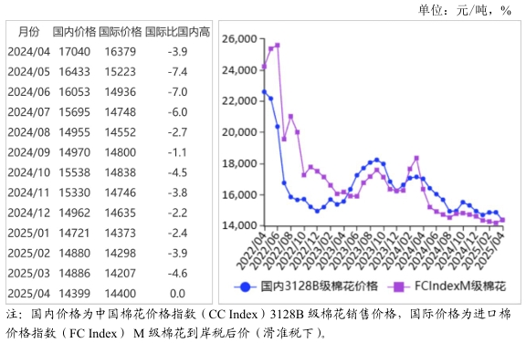 (一)國(guó)內(nèi)棉價(jià)環(huán)比下跌。由于美國(guó)濫施關(guān)稅影響市場(chǎng)信心,紡企采購(gòu)棉花意愿降低,棉價(jià)環(huán)比下跌。據(jù)《中國(guó)棉花工業(yè)庫(kù)存調(diào)查報(bào)告》數(shù)據(jù),準(zhǔn)備采購(gòu)棉花的企業(yè)占39.5%,環(huán)比減少13.3個(gè)百分點(diǎn),比近五年同期平均水平減少18.3個(gè)百分點(diǎn)。4月,國(guó)內(nèi)3128B級(jí)棉花月均價(jià)每噸14399元,環(huán)比跌3.3%,同比跌15.5%。鄭棉期貨主力合約(CF509)月結(jié)算價(jià)每噸13010元,環(huán)比跌4.3%,同比跌17.1%。