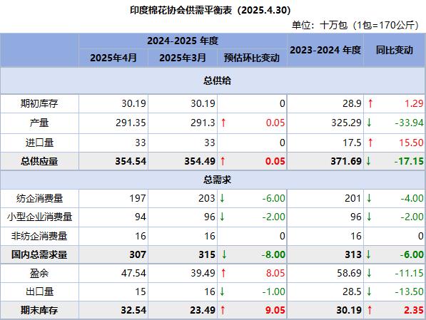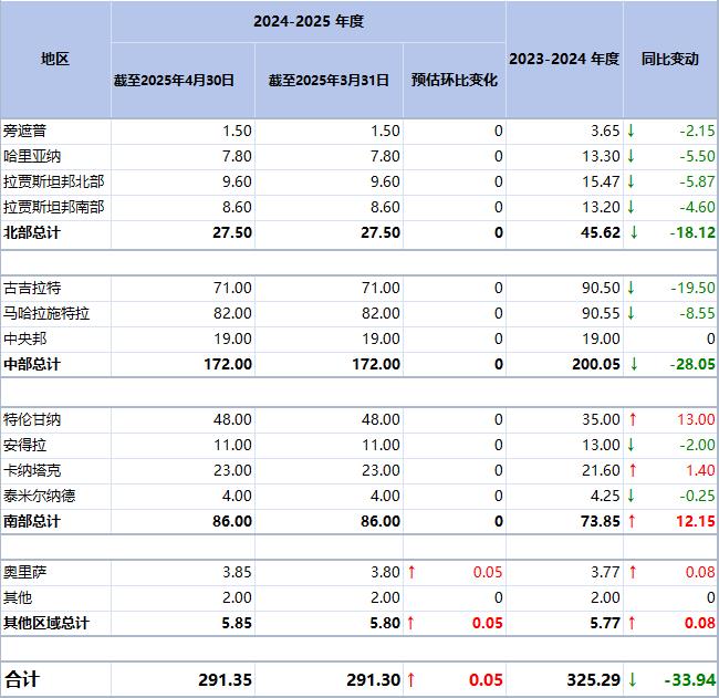 CAI預(yù)計(jì)2024/25年度棉花產(chǎn)量為2913.5萬包。截至4月底,棉花總供應(yīng)量預(yù)估為3258.9萬包。到4月底的消費(fèi)量估計(jì)為1850萬包,出口量為100萬包。4月底的棉花庫存估計(jì)為1308.9萬包,包括紡織廠的350萬包棉花,及印度棉花公司、馬哈拉施特拉邦聯(lián)合會、其他機(jī)構(gòu)(跨國公司、貿(mào)易商、軋花廠、出口商)的剩余958.9萬包棉花,包括已售出但未交付的棉花。