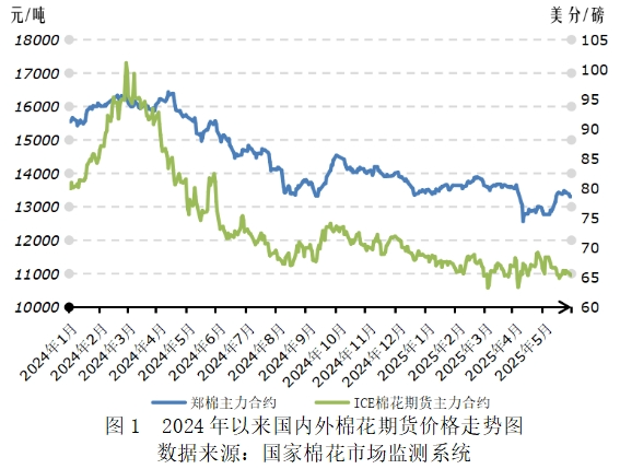 國際市場方面,5月7日中美即將開啟經(jīng)貿(mào)會談的消息提振市場情緒,ICE期棉最高漲至69.1美分/磅,5月12日中美日內(nèi)瓦會談達(dá)成重要共識,雙方承諾大幅下調(diào)此前加征的關(guān)稅稅率,ICE期棉再次上沖,但不及前期高點(diǎn)。隨后受美國農(nóng)業(yè)部預(yù)測2025/26年度美棉產(chǎn)需形勢寬松、美棉產(chǎn)區(qū)天氣良好強(qiáng)化豐產(chǎn)預(yù)期和美棉出口數(shù)據(jù)不佳影響,ICE期棉持續(xù)回落。截至5月28日,ICE棉花期貨主力合約結(jié)算價(jià)月均值66.33美分/磅,較上月下跌0.49美分/磅,跌幅0.73%;代表進(jìn)口棉中國主港到岸均價(jià)的國際棉花指數(shù)(M)75.26美分/磅,折人民幣進(jìn)口成本13176元/噸(1%關(guān)稅,不含港雜費(fèi)),較上月上漲16元/噸,漲幅0.12%。