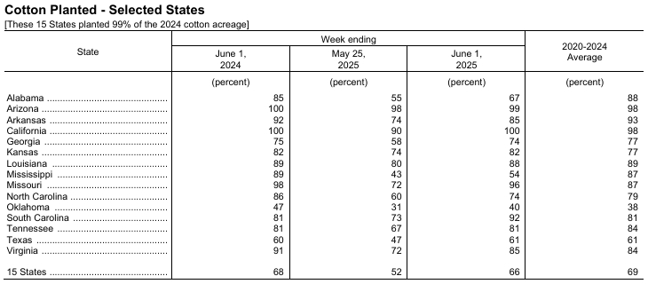 據(jù)美國農業(yè)部網站消息,美國農業(yè)部(USDA)在每周作物生長報告中公布稱,截至2025年6月1日當周,美棉種植率為66%,前周為52%,去年同期為68%,五年均值為69%。美棉現(xiàn)蕾率為8%,前周為3%,上年同期為8%,五年均值為7%。美棉優(yōu)良率為49%,上年同期為61%。