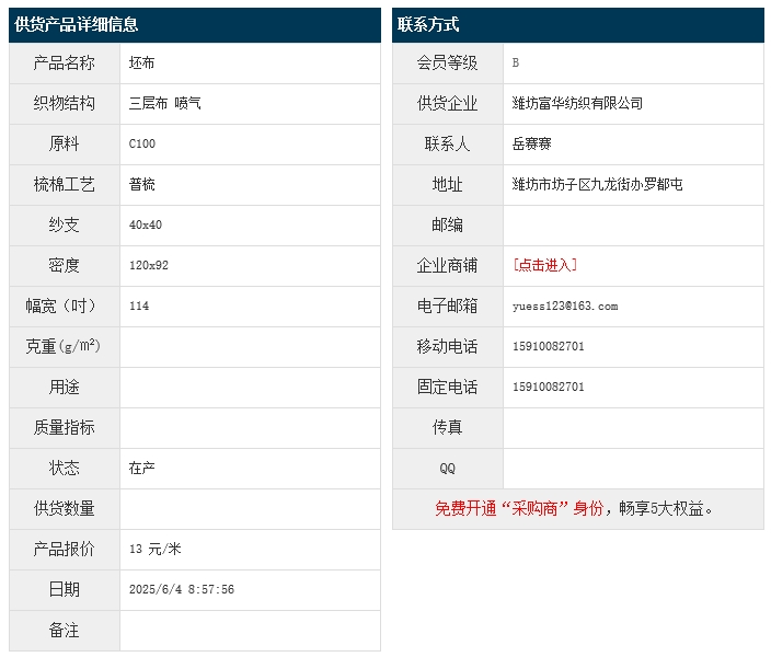 6月4日,濰坊富華紡織有限公司純棉三層布C100 40x40 120x92 114" 噴氣,報價為13元/米,實際成交價以協(xié)商為準(zhǔn)。[點擊查看詳情]