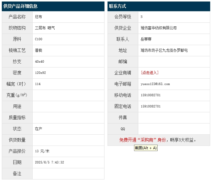6月5日,濰坊富華紡織有限公司純棉三層布C100 40x40 120x92 114" 噴氣,報價為13元/米,實際成交價以協(xié)商為準。[點擊查看詳情]