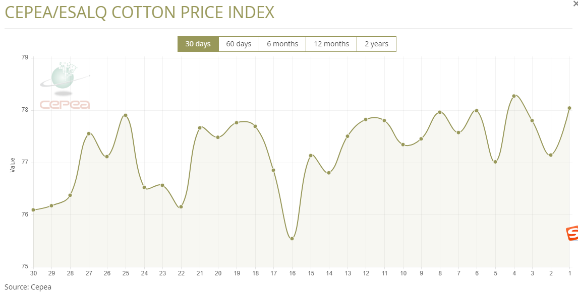 6月5日(周四),巴西CEPEA/ESALQ棉花價(jià)格指數(shù)報(bào)78.04美分/磅,較前一交易日上漲1.17%,較上月同期上漲1.34%。