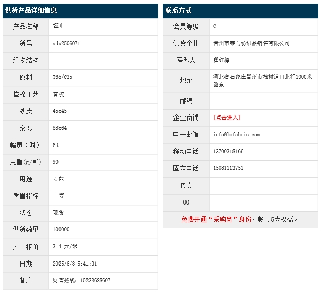 6月7日,晉州榮馬紡織品銷售有限公司滌棉布T65/C35 45x45 88x64 63" 90g/㎡,報(bào)價(jià)為3.4元/米,實(shí)際成交價(jià)以協(xié)商為準(zhǔn)。[點(diǎn)擊查看詳情]