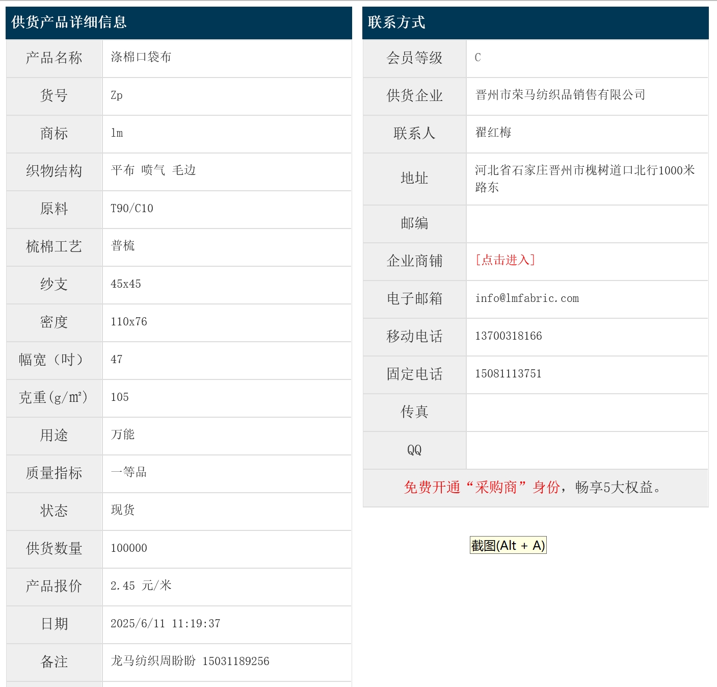 6月11日,晉州榮馬紡織品銷售有限公司滌棉口袋布T90/C10 45x45 110x76 47" 平布 噴氣 毛邊,報價為2.45元/米,實際成交價以協(xié)商為準(zhǔn)。[點擊查看詳情]