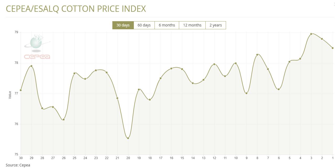 6月11日(周三),巴西CEPEA/ESALQ棉花價格指數(shù)報78.49美分/磅,較前一交易日下跌0.38%,較上月同期上漲1.92%。